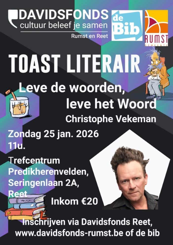 25 jan # 12682 Toast Literair Leve de woorden, leve het Woord zondag 25 januari 2026 van 11:00 uur tot 14:00 uur Over Labels: ActiviteitToast LiterairCultuurregio Antwerpen